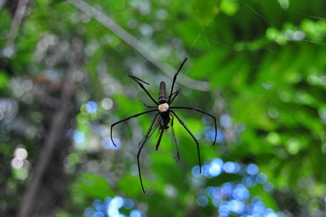 Dafür bekommen wir aber gleich zweimal eine äusserst imposante Spinne zu sehen, welche beide Male ihr Netz quer über den Wanderpfad gespannt hat. Die Spinne hat in etwa die Grösse meiner Hand, der Körper ist etwa so Gross wie die vorderen zwei Glieder meines Zeigefingers. Und ihr kennt mich, ich habe nicht gerade kleine Hände… Bei der zweiten Spinne sehe ich gerade zu, wie ihr Marianna ein Festmahl verschafft. Eine Libelle fliegt auf Mariannas Kopf zu, weicht aus und Schwups, hängt sie im Netz der Spinne. Die reagiert sofort, ist blitzschnell zur Stelle und erwürgt/verbeisst/erdrosselt/was-auch-immert die arme Libelle. Ein schaurig faszinierendes Schauspiel.