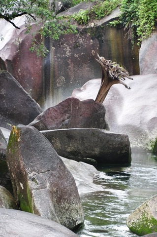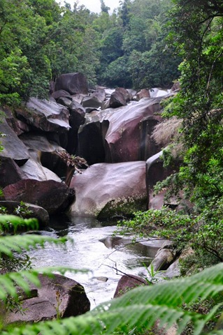 Zwischenstation machen wir bereits 50 km südlich von Cairns in Babinda. Dieser unauffällige Ort hat seine eigene kleine Attraktion in den Touristikkarten und Reiseführern eingetragen bekommen, die Babinda Boulders. Im Wesentlichen besteht die Attraktion aus einem Flüsschen, welches sich oberhalb des Ortes durch grosse Granitsteinformationen zwängt, was zusammen mit dem grünen Urwald darum herum ein äusserst malerisches Bild abgibt. Für alle, welche auch schon einmal in den diversen Tälern des Tessins waren, ist das jetzt nicht sooooo einzigartig. Aber schön ist’s allemal und so machen wir selbstverständlich auch den kurzen Walk zu den verschiedenen Lookouts.