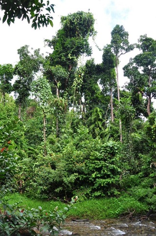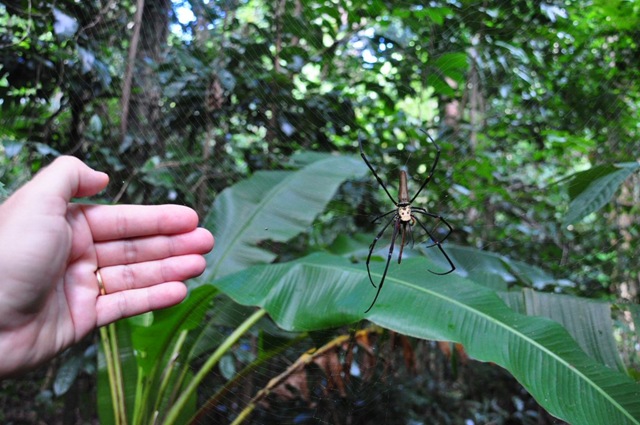 Dafür bekommen wir aber gleich zweimal eine äusserst imposante Spinne zu sehen, welche beide Male ihr Netz quer über den Wanderpfad gespannt hat. Die Spinne hat in etwa die Grösse meiner Hand, der Körper ist etwa so Gross wie die vorderen zwei Glieder meines Zeigefingers. Und ihr kennt mich, ich habe nicht gerade kleine Hände… Bei der zweiten Spinne sehe ich gerade zu, wie ihr Marianna ein Festmahl verschafft. Eine Libelle fliegt auf Mariannas Kopf zu, weicht aus und Schwups, hängt sie im Netz der Spinne. Die reagiert sofort, ist blitzschnell zur Stelle und erwürgt/verbeisst/erdrosselt/was-auch-immert die arme Libelle. Ein schaurig faszinierendes Schauspiel.