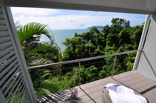 Doch wir werden für die Anfahrts-Mühen belohnt. Eine Art kleines Bungalow im Grünen, schön eingerichtet, kuscheliges Bett mit ebenso kuscheligem Duvet (wir kannten unterdessen nur noch Laken und Decken) und last but not least ein Balkon und direkte Sicht auf den darunterliegenden Urwald, das Meer und Dunk Island. Wun-der-bar! 🙂